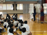 2年生と1年生で班をつくり、学校探検をしました。当日までに、2年生が各教室の紹介ポスターを作って、教室入り口に掲示してくれていました。そのポスターを使って2年生は丁寧に説明し、1年生はしっかりと聞いていました。