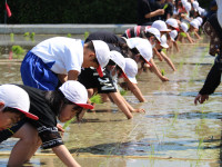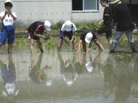 5年生は、田植えを行いました。講師の先生からは、苗の植え方や今後の水の管理の仕方について説明を受けました。水を張った田の中では、泥に足を取られる児童も多くいましたが、苗を植え付ける作業にもすぐに慣れ、午前中いっぱいで、何とか作業を終えることができました。多くの保護者の方に、朝の準備から片付けまでサポートしていただきました。暑い中、ありがとうございました。
