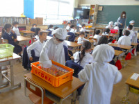 今日から、1年生も給食を食べます。初めてのことなので、身支度から準備、配膳と一つ一つ確認しながら取り組みました。